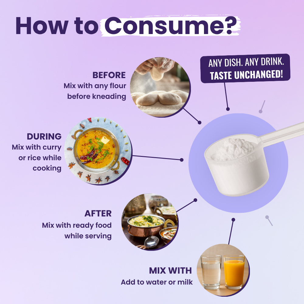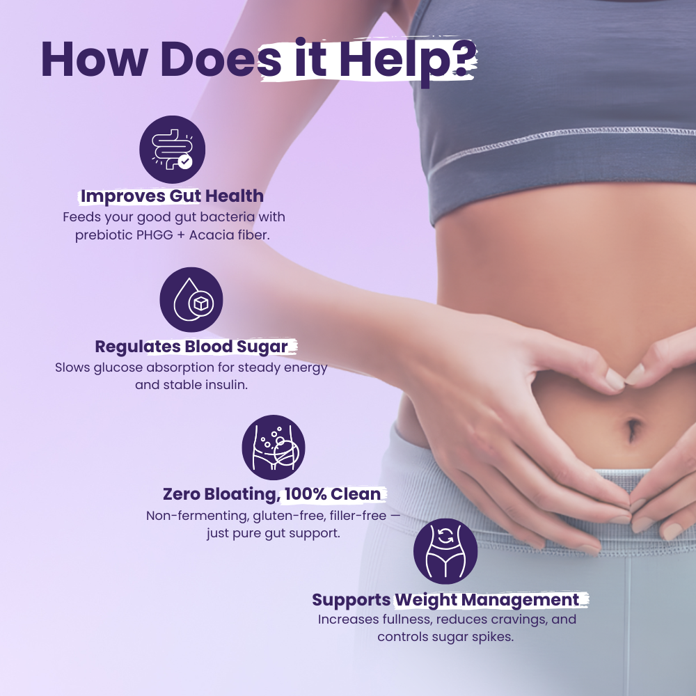 Made from the guar bean grown in Indian soil, this fiber is partially hydrolyzed — gently broken down to dissolve easily and stay light on your stomach. It retains its natural prebiotic strength, supporting smooth digestion every day.