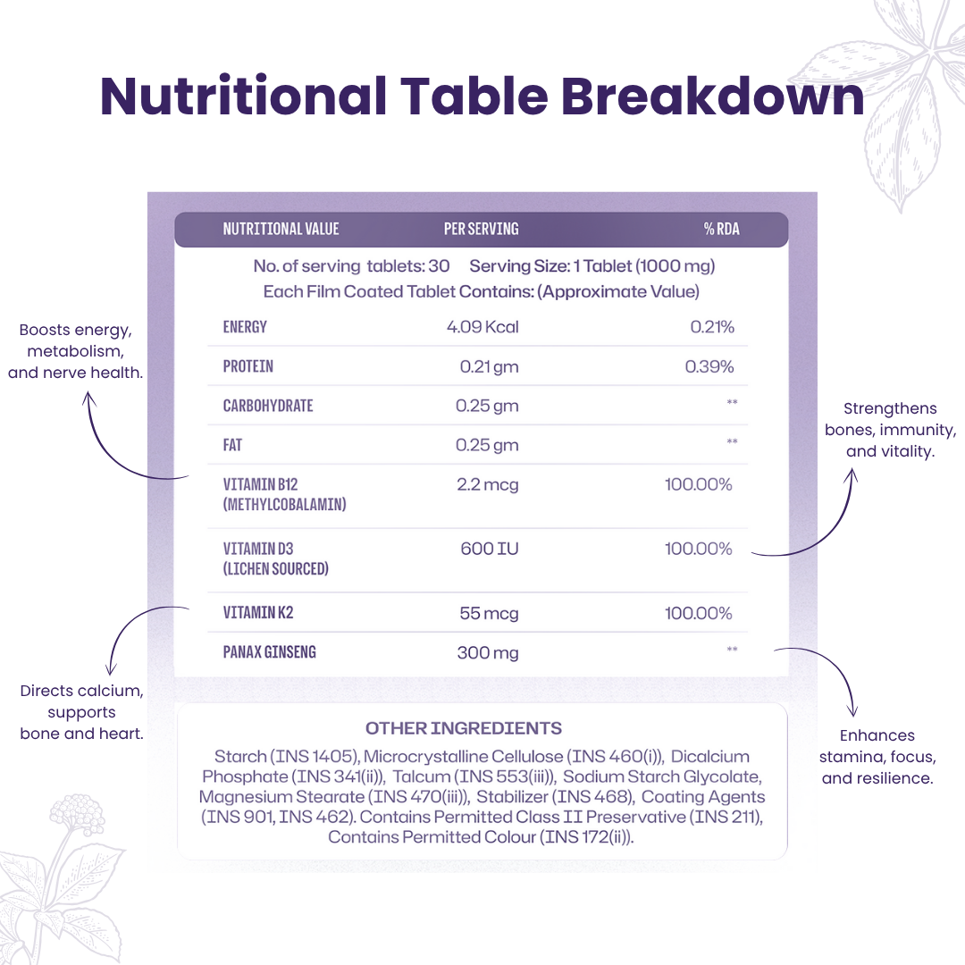 Vitamin K2 is crucial for bone and heart health, working in synergy with D3 to ensure calcium reaches the right places. VitaEnergy uses pharma-grade K2, providing 55 mcg (100% RDA) in a 100% vegetarian, bioavailable form. It supports your body’s long-term wellness with every serving.
