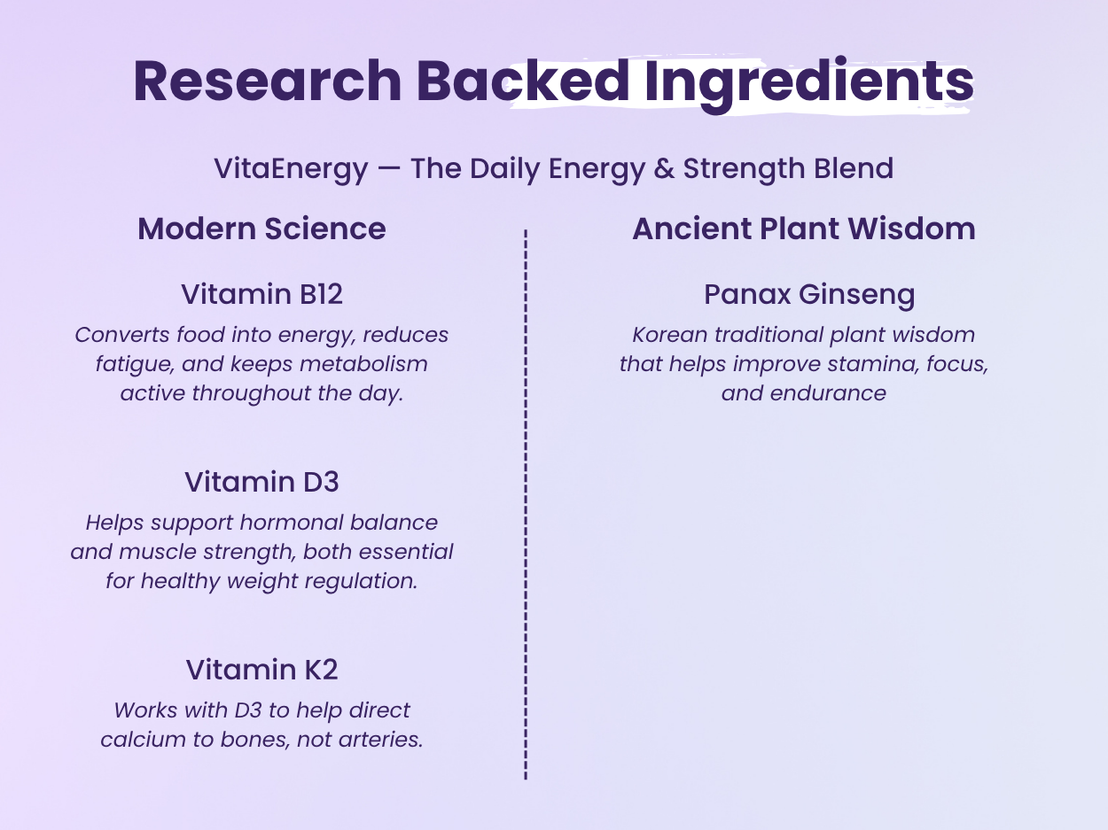 - Panax Ginseng (Korean Red Ginseng) — Enhances stamina, focus, and endurance, helping maintain activity and calorie burn.