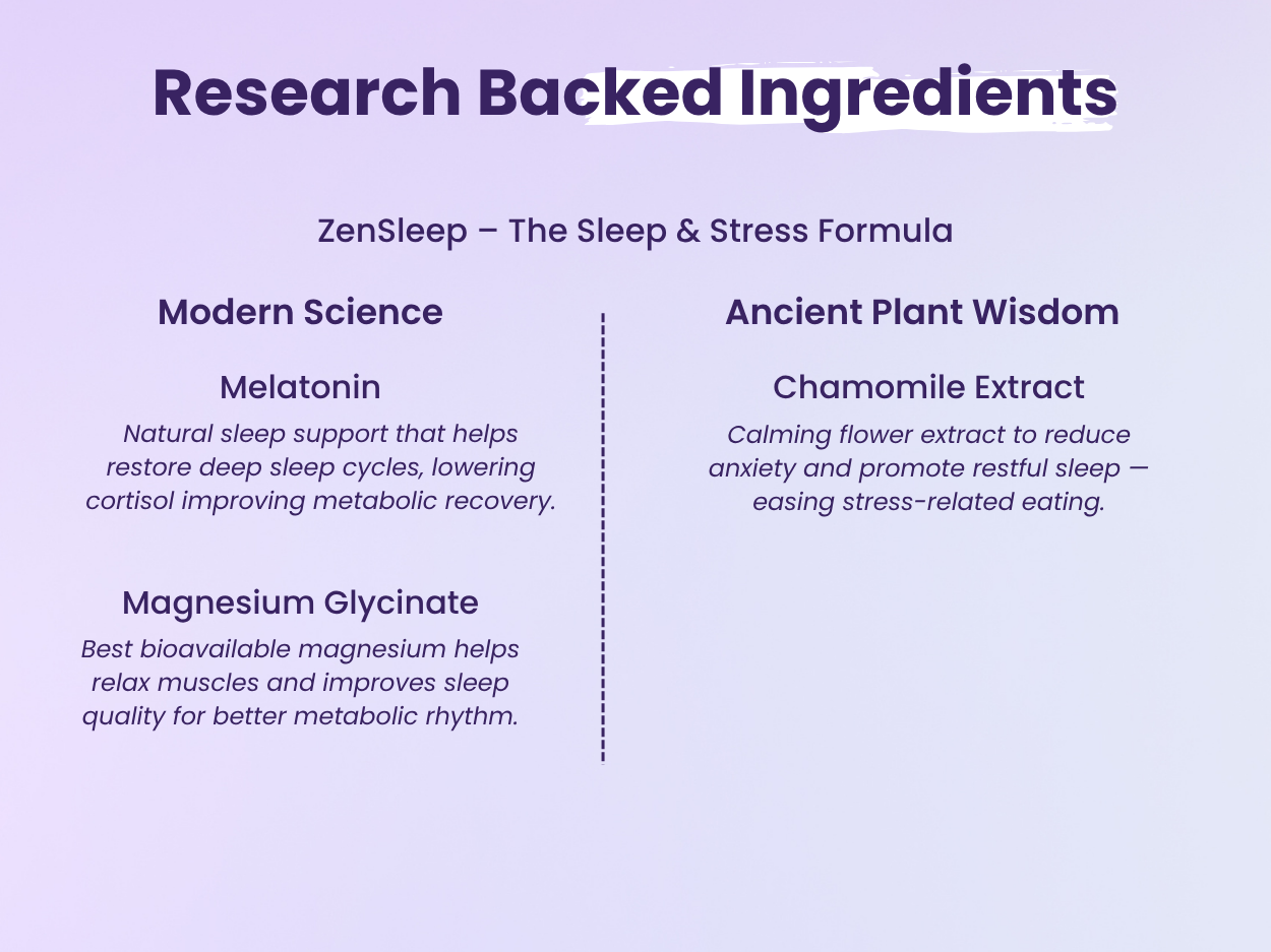 - Chamomile Extract — Soothes anxiety, helping prevent stress-related eating.